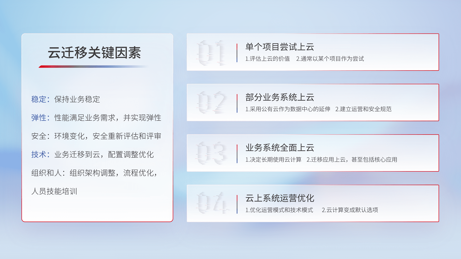 结合实际业务,,,从规划设计、、云平台选型、、、云原生改造、、、数据迁移、、集成交付,,迁移全过程为客户识别最佳上云路径,,,,做好风险识别管理,,,设计网络架构、、、、身份权限、、、安全审计合规、、、、操作审计、、、日志审计、、、、监控告警策略、、多站点容灾设计等,,对云上基础设施进行整体规划,,提升IT治理水平,,以满足弹性、、、、高可用、、、高性能的需求。。