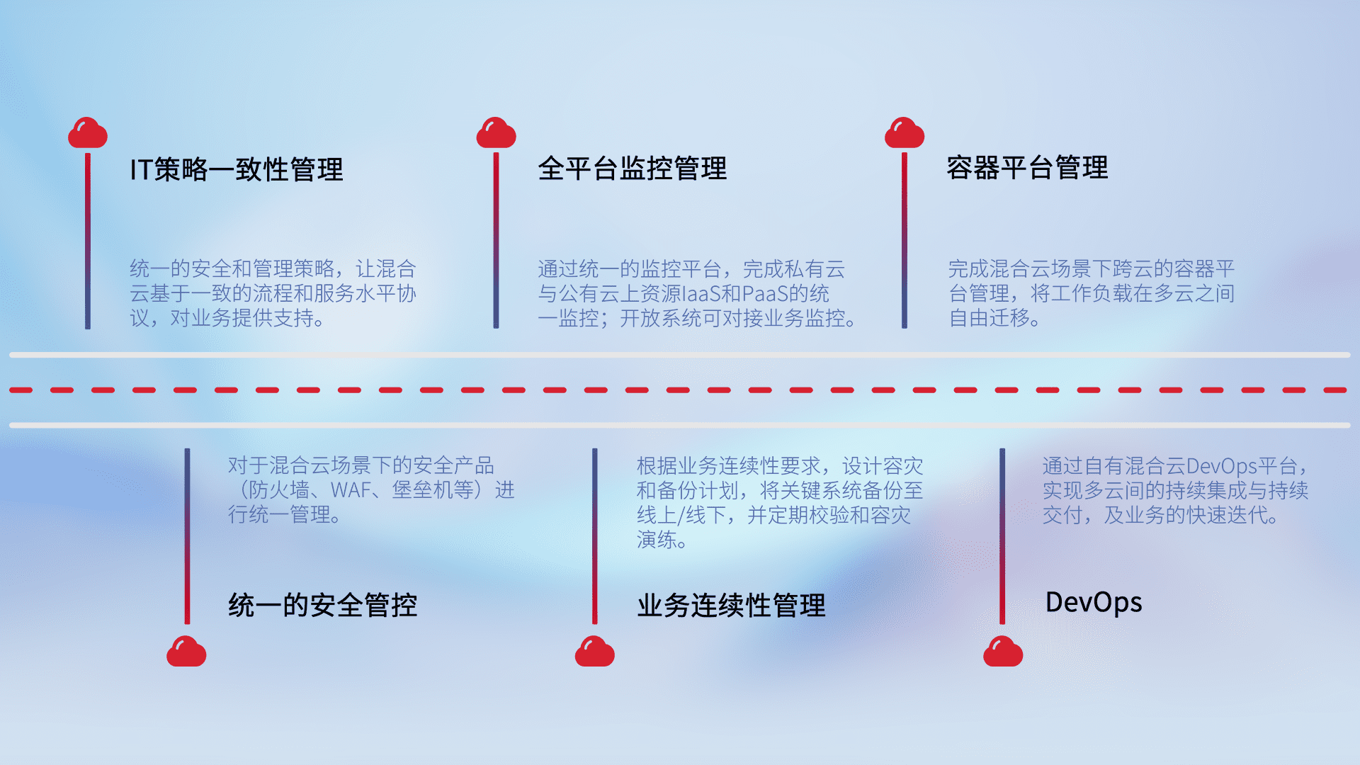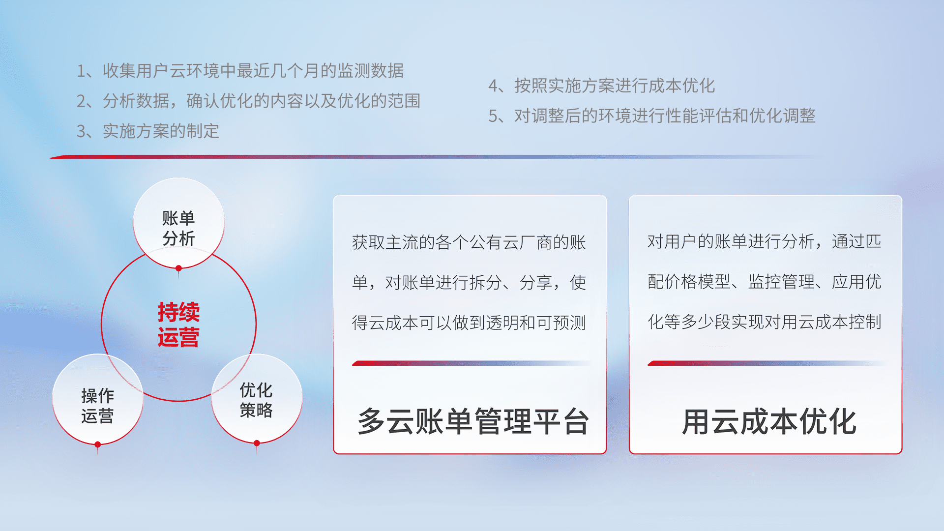 通过多云纳管,,以统一的资源数据模型把客户的云资源进行抽象和封装,,,,进而实现对多云资源的统一操作,,,,保障云资源管理的可靠性、、稳定性与可用性。。。。量身定制化运维内容,,配置、、、、开发运维、、、补丁管理、、备份、、、、监控、、认证和访问管理、、、审计和日常巡检等,,,,保障在用云过程中的可靠度,,,稳定度以及高可用率。。