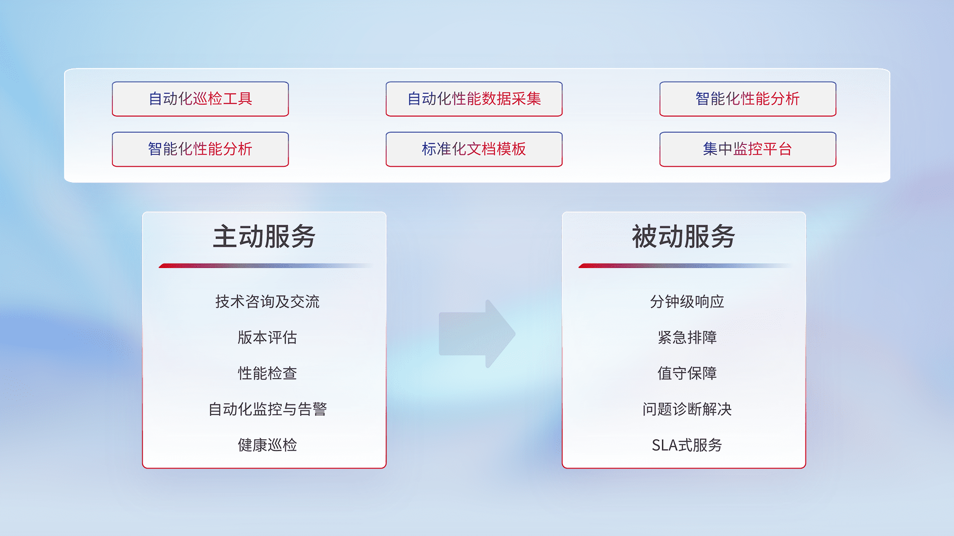 智能化工具和标准化文档,,,保障服务质量,,提供主动服务(包含技术咨询、、版本评估、、、、性能检查、、自动化监控与告警、、、、健康巡检)和被动服务包含(分钟级响应、、紧急排障、、值守保障、、、问题诊断解决、、、SLA服务)。。