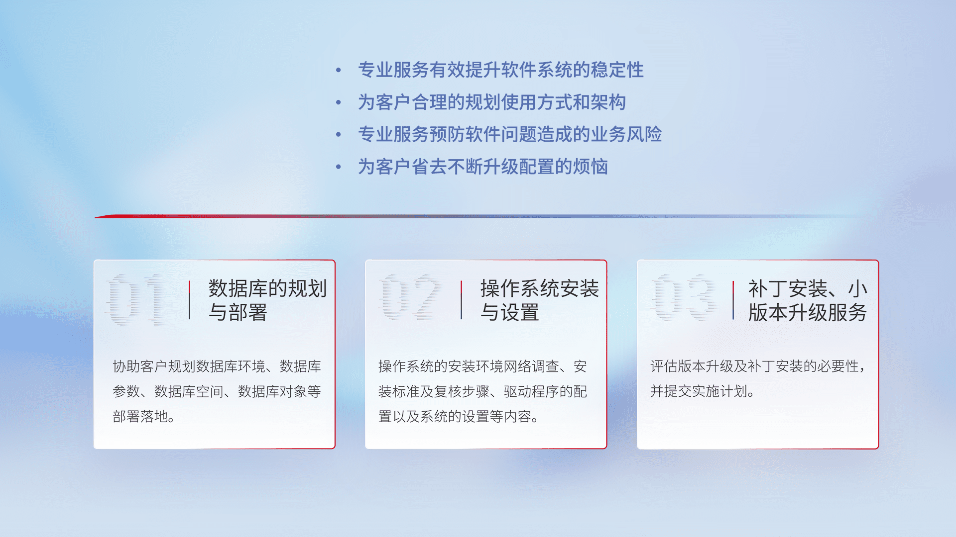 为客户提供软件规模升级、、、、快速部署、、按需配置的专业服务,,,,从数据库的规划与部署到操作系统的安装与设置,,再到补丁安装和小版本升级提供支持。。。